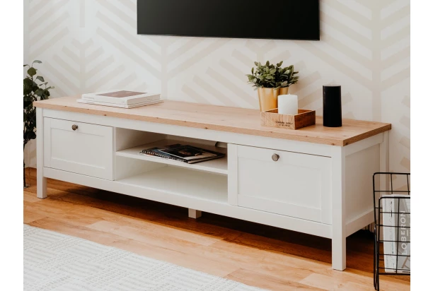 TV skrinka z kolekcie Bergen – nábytok v pôvabnom vidieckom štýle je vyrobený v kombinácii biela/dub artisan. Predné plochy s výraznými reliéfmi dopĺňajú široké rámy a kovové úchytky s efektom patiny, ktoré dotvárajú celkový dizajn nábytku.