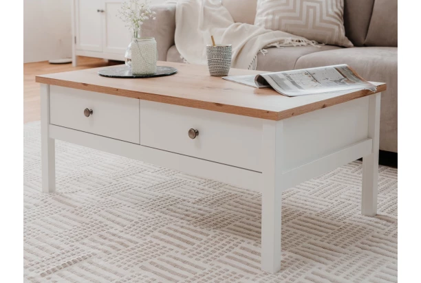 Konferenčný stolík so zásuvkami z kolekcie Bergen – nábytok v pôvabnom vidieckom štýle je vyrobený v kombinácii biela/dub artisan. Predné plochy s výraznými reliéfmi dopĺňajú široké rámy a kovové úchytky s efektom patiny, ktoré dotvárajú celkový dizajn nábytku.