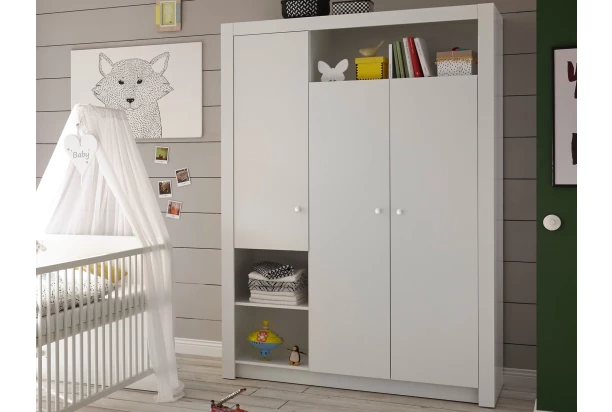 Šatníková skriňa z programu Paula – nábytok do detskej izbičky v bielom prevedení ľahko zladíte s akýmikoľvek doplnkami pre chlapcov aj pre dievčatká. Univerzálna biela skriňa má 3 otočné dvere, vnútorné police, šatníkovú tyč a praktické otvorené priehradky, ktoré využijete napríklad na odkladanie hračiek, doplnkov alebo plienok, ktoré potrebujete mať vždy po ruke. Zaguľatené úchytky môžete navyše ľubovoľne doplniť dekoračnými krúžkami v modrej alebo ružovej farbe, ktoré sú súčasťou výbavy skrine. Túto univerzálnu bielu skriňu však môžete využiť aj v klasickej spálni alebo kdekoľvek v chodbe.