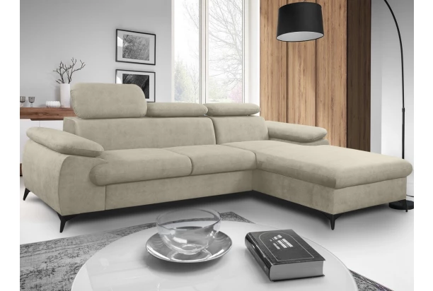 Moderná rohová sedačka Scala poskytuje komfort bez kompromisu v akomkoľvek veľkom priestore obývačky. Okrem ideálnych rozmerov ponúka komfortne ladené sedenie doplnené o chrbtové opierky, pri ktorých si môžete nastavovať sklon a prispôsobiť si tak pohodlie podľa seba. V prípade relaxácie využijete priestranný otoman, ktorý pri sedačke vytvára pravý roh. Očalúnená látkou s príjemne mäkkou štruktúrou v odtieni béžová. Sedacia súprava je tiež vybavená úložným priestorom – ľahko prístupný z prednej strany otomanu. Čierne kovové nohy poskytujú stabilitu a vďaka ich správnej výške je možné pod sedačkou použiť aj robotický vysávač. Táto nadčasová sedačka je jednoducho prispôsobená štandardom dnešnej doby.