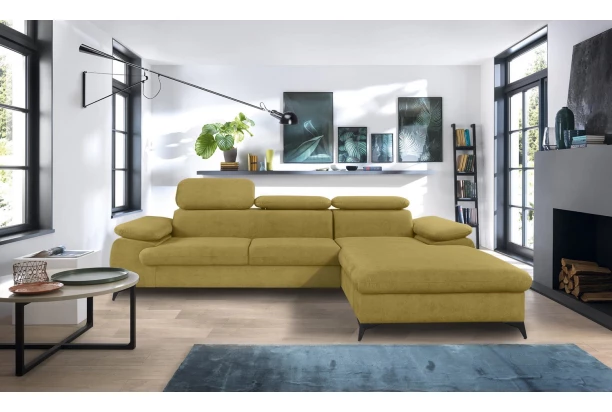 Moderná rohová sedačka Scala poskytuje komfort bez kompromisu v akomkoľvek veľkom priestore obývačky. Okrem ideálnych rozmerov ponúka komfortne ladené sedenie doplnené o chrbtové opierky, pri ktorých si môžete nastavovať sklon a prispôsobiť si tak pohodlie podľa seba. V prípade relaxácie využijete priestranný otoman, ktorý pri sedačke vytvára pravý roh. Očalúnená látkou s príjemne mäkkou štruktúrou v odtieni kurkumovo žltá. Sedacia súprava je tiež vybavená úložným priestorom – ľahko prístupný z prednej strany otomanu. Čierne kovové nohy poskytujú stabilitu a vďaka ich správnej výške je možné pod sedačkou použiť aj robotický vysávač. Táto nadčasová sedačka je jednoducho prispôsobená štandardom dnešnej doby.