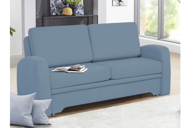 Elegantná pohovka so zaoblenými tvarmi a vankúšmi je vybavená úložným priestorom v dolnej časti a rozkladom na lôžko pre príležitostné aj trvalé spanie. Očalúnená velúrovou látkou v odtieni modrá aqua.