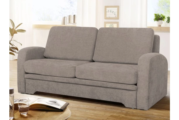Elegantná pohovka so zaoblenými tvarmi a vankúšmi je vybavená úložným priestorom v dolnej časti a rozkladom na lôžko pre príležitostné aj trvalé spanie. Očalúnená velúrovou látkou v odtieni béžová taupe.