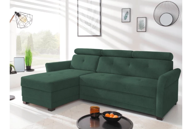 Rohová sedacia súprava Harris je ideálnou voľbou do malého priestoru a univerzálnym štýlom pasuje do každej obývačky. Potiahnutá príjemnou látkou vo farbe zelená, pohodlné vypolstrovanie dopĺňajú polohovateľné opierky na individuálne nastavenie komfortu. S bočným otomanom tvorí sedačka ľavý roh. Úložný priestor a rozklad na lôžko plní praktickú rolu, lôžko môžete tiež použiť pre trvalé spanie.