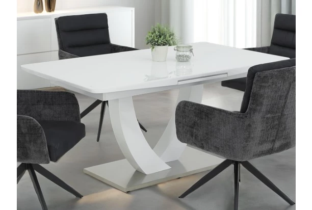 Lesklý biely jedálenský stôl o veľkosti 160×90 cm má moderný dizajn a vďaka rozkladacej funkcii sa dokáže rozšíriť na 200 cm. Obdĺžniková jedálenská plocha stola je pokrytá sklom a stôl tak pôsobí luxusným dojmom. Dvojitá zaoblená podnož má lesklo biely povrch a je kombinovaná kovom v optike brúseného nerezu. Tento obdĺžnikový stôl sa úžasne hodí do moderne zariadeného interiéru jedálne, kde vynikne.