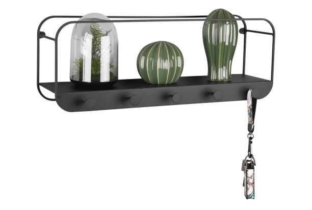 Moderný nástenný vešiak s praktickou policou so šírkou 50 cm je vyrobený z čierneho kovu a dokonale doplní Vašu predsieň alebo šatňu. 5 háčikov ,ponúka dostatok miesta pre bundy, šály, čiapky alebo napríklad tašky. Horná polica je ideálna pre umiestnenie doplnkov k oblečeniu, kľúčov, peňaženky alebo drobných dekorácií. Vďaka tomuto vešiaku, budete mať svoj domov stále uprataný.