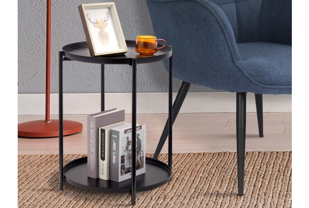 Praktický čierny odkladací stolík je vyrobený z kovu a dobre poslúži vedľa sedačky alebo kdekoľvek v rohu miestnosti na umiestnenie lampičky, časopisov, dekorácií alebo aj ako stolík na kvety.