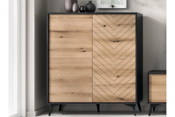 Vysoká 2-dverová skrinka so šírkou 104 cm z kolekcie Diamond – inšpiratívny, elegantný a pritom veľmi útulný nábytok pre váš moderne zariadený domov. Dubový drevodekor s okrasnými frézovanými líniami vytvára spolu s čiernymi povrchmi veľmi príjemný kontrast. Celý dizajn potom dotvára čierne kovové nohy, vďaka ktorým celý interiér pôsobí vzdušne. Voľný priestor pod nábytkom tak umožní ľahkú údržbu podlahy, čo je veľmi praktické. Prípadne môžete na upratovanie využiť aj váš robotický vysávač, ktorému nič nebude brániť v ceste počas jeho vysávania alebo vytierania.