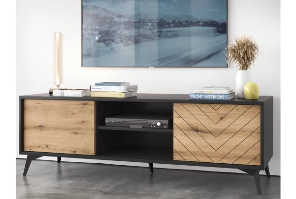 TV skrinka so šírkou 154 cm z kolekcie Diamond – inšpiratívny, elegantný a pritom veľmi útulný nábytok pre váš moderne zariadený domov. Dubový drevodekor s okrasnými frézovanými líniami vytvára spolu s čiernymi povrchmi veľmi príjemný kontrast. Celý dizajn potom dotvára čierne kovové nohy, vďaka ktorým celý interiér pôsobí vzdušne. Voľný priestor pod nábytkom tak umožní ľahkú údržbu podlahy, čo je veľmi praktické. Prípadne môžete na upratovanie využiť aj váš robotický vysávač, ktorému nič nebude brániť v ceste počas jeho vysávania alebo vytierania.