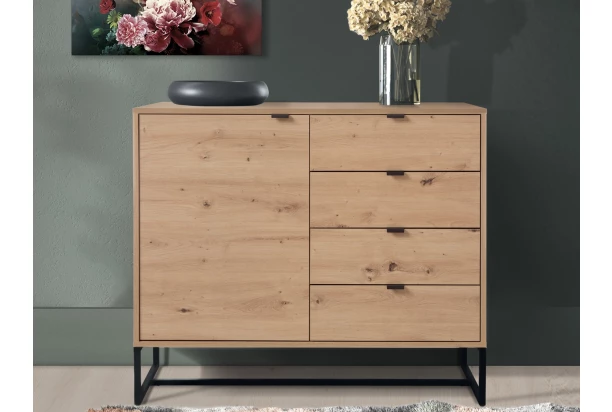 Skrinka so zásuvkami z kolekcie Amber – moderný a zároveň praktický nábytok v minimalistickom štýle. Vyrobený v kombinácii príjemne hrejivého drevodekoru dub artisan s kontrastnou podnožou z čierneho kovu. Nábytok je tak stabilný, opticky pôsobí ľahko a navyše úžasne zapadne do konceptu vášho štýlového bývania.
