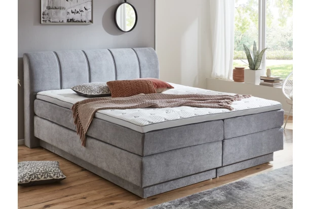 Pohodlne vysoká posteľ typu boxspring o veľkosti lôžka 180×200 cm so zaobleným a prešívaným čelom. Dve vrstvy vysokých komfortných matracov spolu s horným topperom sa postarajú o veľmi pohodlné spanie. Mäkké látkové čalúnenie vo farbe svetlo šedá zvýrazňuje tvary postele. Praktický úložný priestor je ľahko prístupný z bočných strán postele a je možné ho využiť napríklad na uschovanie posteľnej bielizne.