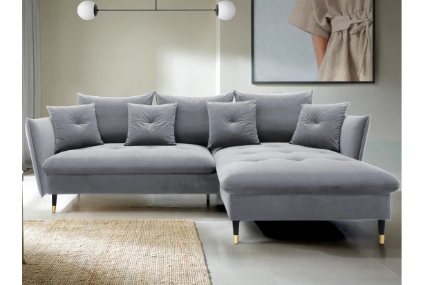 Rohová sedacia súprava v elegantnom glamour štýle pôsobí pohodlne – a to nielen na pohľad, pohodlná totiž naozaj je. Príjemne vypolstrované sedenie, veľké vankúše a relaxačný otoman si ľahko obľúbite. Očalúnená látkou zamatového vzhľadu v odtieni svetlo šedá. Elegantný dizajn navyše podčiarkujú stabilné čierno-zlaté kovové nohy, pod ktoré sa ľahko dostane napríklad aj váš robotický vysávač. Vyhotovenie sedačky s otomanom vytvára pravý roh. Pod sedákom je ukrytý praktický ukladací priestor a sedačku je možné využiť aj na príležitostné spanie vďaka rozkladacej funkcii. Svojimi rozmermi ľahko pasuje do takmer každého rohu obývačky, kde vytvorí útulné domáce prostredie.