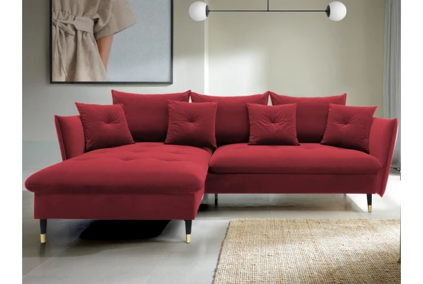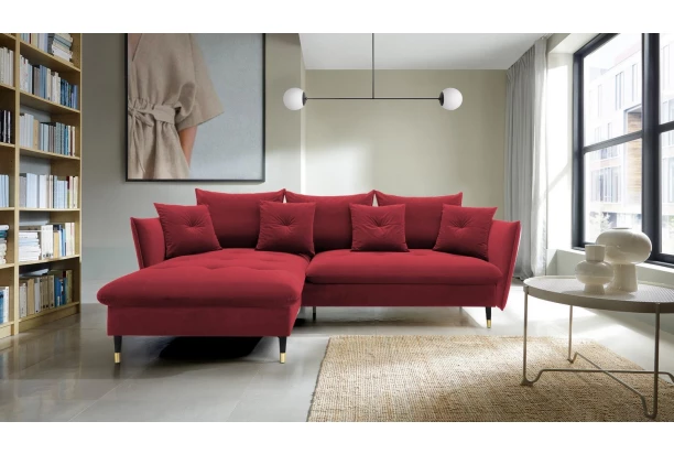 Rohová sedacia súprava v elegantnom glamour štýle pôsobí pohodlne – a to nielen na pohľad, pohodlná totiž naozaj je. Príjemne vypolstrované sedenie, veľké vankúše a relaxačný otoman si ľahko obľúbite. Očalúnená látkou zamatového vzhľadu v odtieni rubínovo červená. Elegantný dizajn navyše podčiarkujú stabilné čierno-zlaté kovové nohy, pod ktoré sa ľahko dostane napríklad aj váš robotický vysávač. Vyhotovenie sedačky s otomanom vytvára ľavý roh. Pod sedákom je ukrytý praktický ukladací priestor a sedačku je možné využiť aj na príležitostné spanie vďaka rozkladacej funkcii. Svojimi rozmermi ľahko pasuje do takmer každého rohu obývačky, kde vytvorí útulné domáce prostredie.