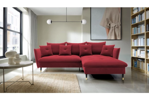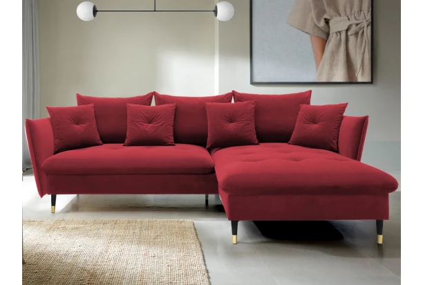 Rohová sedacia súprava v elegantnom glamour štýle pôsobí pohodlne – a to nielen na pohľad, pohodlná totiž naozaj je. Príjemne vypolstrované sedenie, veľké vankúše a relaxačný otoman si ľahko obľúbite. Očalúnená látkou zamatového vzhľadu v odtieni rubínovo červená. Elegantný dizajn navyše podčiarkujú stabilné čierno-zlaté kovové nohy, pod ktoré sa ľahko dostane napríklad aj váš robotický vysávač. Vyhotovenie sedačky s otomanom vytvára pravý roh. Pod sedákom je ukrytý praktický ukladací priestor a sedačku je možné využiť aj na príležitostné spanie vďaka rozkladacej funkcii. Svojimi rozmermi ľahko pasuje do takmer každého rohu obývačky, kde vytvorí útulné domáce prostredie.