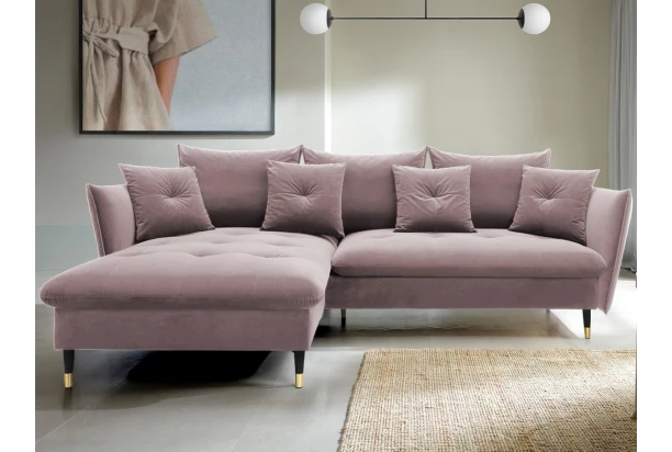 Rohová sedacia súprava v elegantnom glamour štýle pôsobí pohodlne – a to nielen na pohľad, pohodlná totiž naozaj je. Príjemne vypolstrované sedenie, veľké vankúše a relaxačný otoman si ľahko obľúbite. Očalúnená látkou zamatového vzhľadu v odtieni ružová. Elegantný dizajn navyše podčiarkujú stabilné čierno-zlaté kovové nohy, pod ktoré sa ľahko dostane napríklad aj váš robotický vysávač. Vyhotovenie sedačky s otomanom vytvára ľavý roh. Pod sedákom je ukrytý praktický ukladací priestor a sedačku je možné využiť aj na príležitostné spanie vďaka rozkladacej funkcii. Svojimi rozmermi ľahko pasuje do takmer každého rohu obývačky, kde vytvorí útulné domáce prostredie.