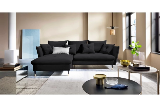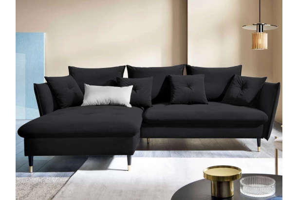 Rohová sedacia súprava v elegantnom glamour štýle pôsobí pohodlne – a to nielen na pohľad, pohodlná totiž naozaj je. Príjemne vypolstrované sedenie, veľké vankúše a relaxačný otoman si ľahko obľúbite. Očalúnená látkou zamatového vzhľadu vo farbe čierna. Elegantný dizajn navyše podčiarkujú stabilné čierno-zlaté kovové nohy, pod ktoré sa ľahko dostane napríklad aj váš robotický vysávač. Vyhotovenie sedačky s otomanom vytvára ľavý roh. Pod sedákom je ukrytý praktický ukladací priestor a sedačku je možné využiť aj na príležitostné spanie vďaka rozkladacej funkcii. Svojimi rozmermi ľahko pasuje do takmer každého rohu obývačky, kde vytvorí útulné domáce prostredie.