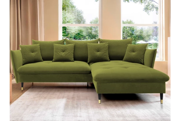 Rohová sedacia súprava v elegantnom glamour štýle pôsobí pohodlne – a to nielen na pohľad, pohodlná totiž naozaj je. Príjemne vypolstrované sedenie, veľké vankúše a relaxačný otoman si ľahko obľúbite. Očalúnená látkou zamatového vzhľadu v odtieni machová zelená. Elegantný dizajn navyše podčiarkujú stabilné čierno-zlaté kovové nohy, pod ktoré sa ľahko dostane napríklad aj váš robotický vysávač. Vyhotovenie sedačky s otomanom vytvára pravý roh. Pod sedákom je ukrytý praktický ukladací priestor a sedačku je možné využiť aj na príležitostné spanie vďaka rozkladacej funkcii. Svojimi rozmermi ľahko pasuje do takmer každého rohu obývačky, kde vytvorí útulné domáce prostredie.
