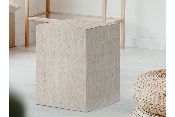 Štýlový taburet s potlačeným motívom béžovej tkaniny juta zaujme na pohľad. Vďaka ľahkej konštrukcii z vystuženého kartónu je možné ľahko premiestniť alebo kedykoľvek jednoducho zložiť a uschovať.