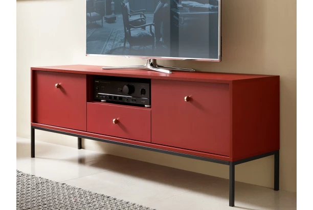 TV skrinka z kolekcie Mono vo farbe červená – to je moderná elegancia s glamour nádychom. Atraktívny dizajn podčiarkujú zlaté úchytky a čierna kovová podnož, vďaka ktorej nábytok pôsobí vzdušne a zároveň umožňuje praktickú údržbu podlahy. Nábytok tak doplní štýlovú atmosféru vášho bytu. Skrinka sa dá kombinovať aj s ďalšími elementmi tohto nábytkového radu, prípadne môže byť umiestnená v interiéri aj samostatne ako zaujímavý solitér.