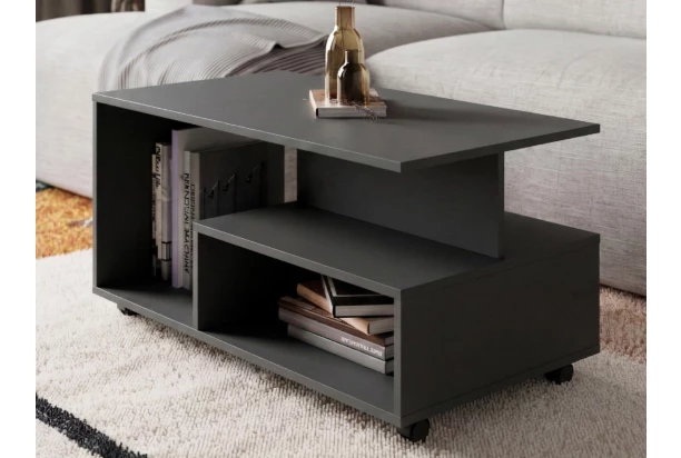 Konferenčný stolík na kolieskach je navrhnutý tak, aby rôzne veľké priehradky mohli poskytnúť priestor na odkladanie rôzne veľkých vecí, ktoré potom budete mať vo svojej obývačke ľahko vždy po ruke. Vyrobený v antracitovej farbe.