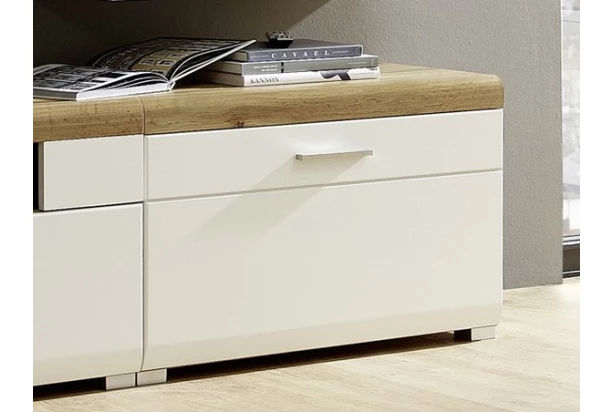 Nízka skrinka so šírkou 80 cm v kombinácii dub wotan s bielymi plochami a elegantne zaoblenými líniami. Ponúka jednu úložnú zásuvku, v ktorej sa navyše po otvorení ukrýva jedna priehradka.