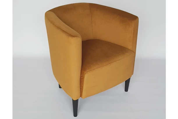 Elegantné zaoblené kreslo na čiernych drevených nôžkach pasuje veľkostne takmer do každého priestoru. Toto univerzálne kresielko je očalúnené látkou v zamatovej optike vo farbe horčicová žltá.