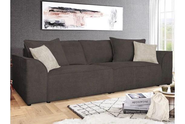 Veľká komfortná pohovka s rôzne veľkými vankúšmi vytvorí príjemné relaxačné prostredie vo vašej obývačke. Očalúnená mäkkučkou látkou s dlhším štruktúrovaným vlasom v odtieni hnedá, ktorá doplní útulnú atmosféru bytu. Po odobratí vankúšov môžete získať dostatočný priestor na príležitostné prespanie napríklad vašej návštevy. Pohovku môžete umiestniť nielen priamo k stene, ale skvele vynikne aj v priestore obývačky. Doplnená malými vankúšmi vo farbe béžová.