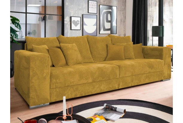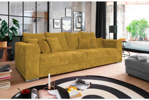 Široká pohovka s veľkými vankúšmi ponúka ideálny priestor pre skvelú domácu pohodu. Na útulnosti pridáva aj mäkkučká poťahová látka s prúžkovanou štruktúrou v odtieni horčicová žltá. Priestranná pohovka tak vytvorí útulný stredobod vašej obývačky. Môže byť umiestnená k stene alebo aj doprostred miestnosti, kde vynikne. Po odobratí vankúšov môže ponúknuť aj dostatočný priestor na prespanie návštevy. Táto veľká pohovka v modernom nadčasovom štýle sa hodí ako do bytu, tak aj do rodinného domu.