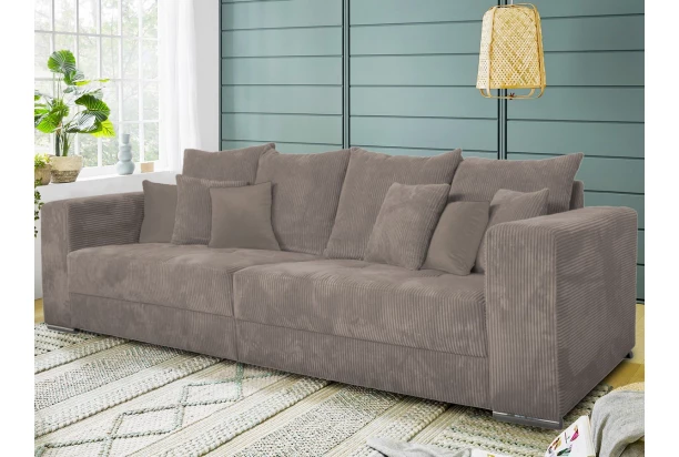 Široká pohovka s veľkými vankúšmi ponúka ideálny priestor pre skvelú domácu pohodu. Na útulnosti pridáva aj mäkkučká poťahová látka s prúžkovanou štruktúrou v odtieni béžová taupe. Priestranná pohovka tak vytvorí útulný stredobod vašej obývačky. Môže byť umiestnená k stene alebo aj doprostred miestnosti, kde vynikne. Po odobratí vankúšov môže ponúknuť aj dostatočný priestor na prespanie návštevy. Táto veľká pohovka v modernom nadčasovom štýle sa hodí ako do bytu, tak aj do rodinného domu.