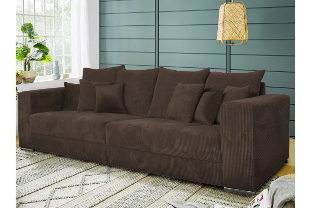 Široká pohovka s veľkými vankúšmi, ponúka ideálny priestor pre skvelú domácu pohodu. Na útulnosti pridáva aj mäkkučká poťahová látka s prúžkovanou štruktúrou v odtieni hnedá. Priestranná pohovka, tak vytvorí útulný stredobod vašej obývačky. Môže byť umiestnená k stene alebo aj doprostred miestnosti, kde vynikne. Po odobratí vankúšov, môže ponúknuť aj dostatočný priestor na prespanie návštevy. Táto veľká pohovka v modernom nadčasovom štýle sa hodí ako do bytu, tak aj do rodinného domu.