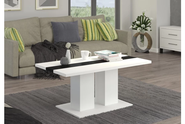 Konferenčný stolík na stabilnej dvojitej podnoži pôsobí v priestore obývačky vzdušne. Obdĺžna plocha o veľkosti 110×60 cm je vyrobená v kombinácii biela s čiernym stredovým pruhom.