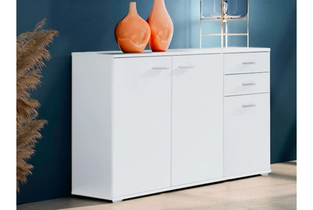 Komoda so zásuvkami o šírke 106 cm vo farbe biela. Jednoduchým a úplne univerzálnym štýlom sa hodí do akejkoľvek miestnosti.