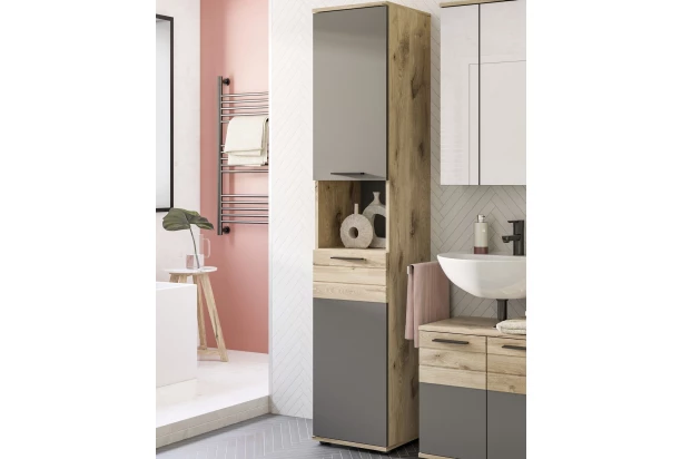 Vysoká kúpeľňová skrinka Mason, dub/šedá