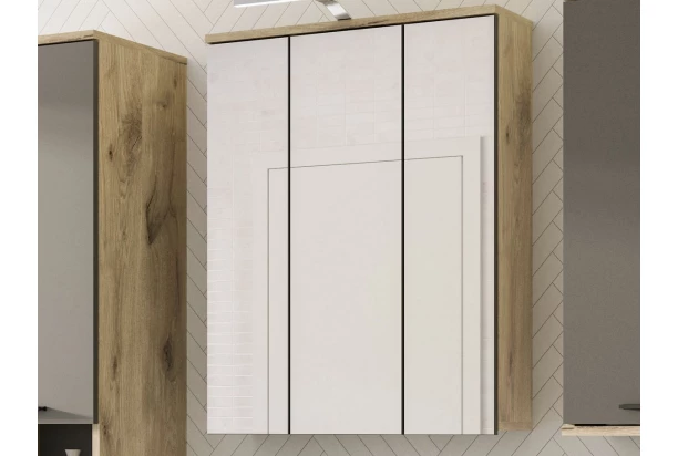 Kúpeľňová zrkadlová skrinka z kolekcie Mason – moderný a praktický nábytok v dubovom drevodekore. Závesná skrinka ponúka zrkadlové dvere, za ktorými nájdete úložné priestory s praktickými poličkami. Moderný dizajn a vysoko kvalitné spracovanie z nej robí funkčný a esteticky príjemný kus nábytku do vášho domáceho prostredia.