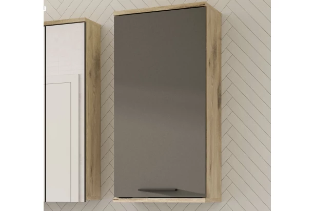 Závesná kúpeľňová skrinka z kolekcie Mason – moderný a praktický nábytok v kombinácii dubového drevodekoru a šedých plôch. Moderný dizajn a vysoko kvalitné spracovanie z nej robí funkčný a esteticky príjemný kus nábytku do vášho domáceho prostredia.