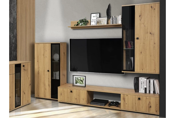 Obývacia stena o praktickej šírke pasuje dobre do každého priestoru obývačky. Drevodekor dub artisan dopĺňajú profilované povrchy, ktoré vytvárajú na predných plochách zaujímavý lamelový efekt. Obľúbená 4-dielna zostava skriniek môže tvoriť spoločne kompaktný celok alebo byť rozmiestnená samostatne v priestore vášho bytu. Vnútorné sklenené poličky vo vnútri vitrín môžete navyše ľubovoľne kombinovať s doplnkovým osvetlením na spríjemnenie večernej atmosféry.