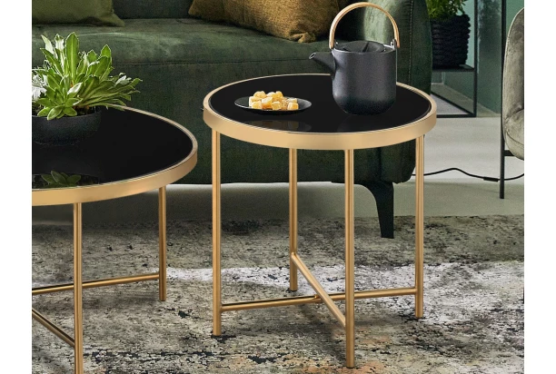 Okrúhly konferenčný/odkladací stolík s priemerom 42 cm má stabilnú kovovú konštrukciu a elegantný dizajn. Lesklé zlaté prevedenie spolu s čiernym sklom pôsobí v interiéri luxusne.