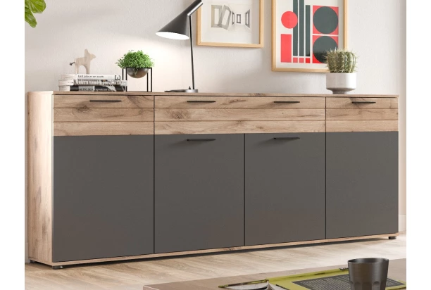 Široká komoda so zásuvkou z kolekcie Mason – moderný a praktický nábytok v kombinácii dubového drevodekoru a šedých plôch ozvláštňujú horizontálne frézované línie, ktoré dodávajú nábytku zaujímavý efekt. Moderný dizajn a vysoko kvalitné spracovanie z nej robí funkčný a esteticky príjemný kus nábytku do vášho domáceho prostredia.
