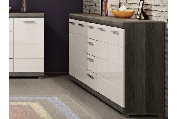 Široká komoda so šuplíkmi z programu Scout – moderný, elegantný a zároveň praktický nábytok v kombinácii šedý dymový dub s lesklo bielymi plochami. Predné plochy so skosenou hranou a decentne frézovanými líniami sú príjemným detailom. Táto komoda so šírkou 165 cm obsahuje kombináciu dverí i zásuviek, poslúži tak prakticky v každej miestnosti, kde potrebujete ukladať najrôznejšie veci.