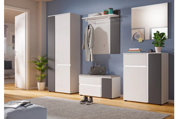 Predsieňový šatníkový panel z kolekcie Kato – moderný minimalistický dizajn nábytku vo farbe biela/antracit dopĺňujú police, háčiky a závesná šatníková tyč.