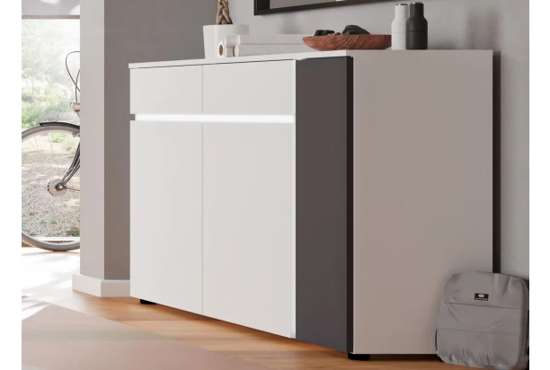 Komoda so zásuvkami z kolekcie Kato – moderný minimalistický dizajn nábytku vo farbe biela/antracit, dopĺňajú biele línie s rafinovane zabudovaným LED osvetlením, ktoré vytvárajú zaujímavý efekt. Originálne riešený nábytok je praktický a zároveň zaujme na pohľad.