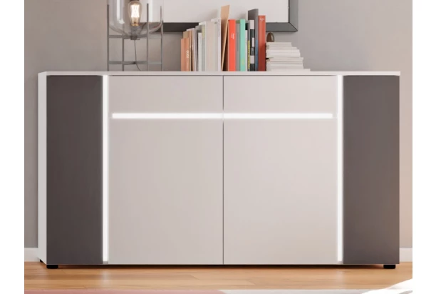 Široká komoda so zásuvkami z kolekcie Kato – moderný minimalistický dizajn nábytku vo farbe biela/antracit, dopĺňajú biele línie s rafinovane zabudovaným LED osvetlením, ktoré vytvárajú zaujímavý efekt. Originálne riešený nábytok je praktický a zároveň zaujme na pohľad.