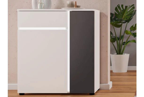 Komoda so zásuvkou z kolekcie Kato – moderný minimalistický dizajn nábytku vo farbe biela/antracit,dopĺňajú biele línie s rafinovane zabudovaným LED osvetlením, ktoré vytvárajú zaujímavý efekt. Originálne riešený nábytok je praktický a zároveň zaujme na pohľad.