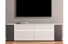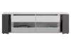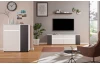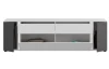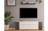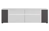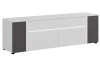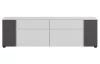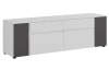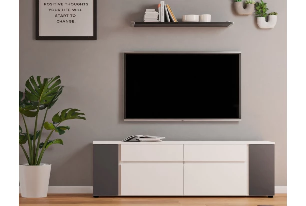 TV skrinka z kolekcie Kato – moderný minimalistický dizajn nábytku vo farbe biela/antracit, dopĺňajú biele línie s rafinovane zabudovaným LED osvetlením, ktoré vytvárajú zaujímavý efekt. Originálne riešený nábytok je praktický a zároveň zaujme na pohľad.