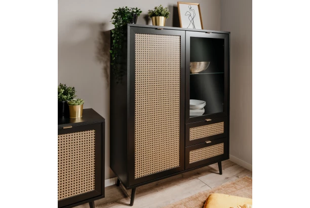 Vysoká skrinka s presklením z kolekcie Vienna – elegantný nábytok v čiernom prevedení v kombinácii s imitáciou prírodného viedenského výpletu zaujme na pohľad a skvele doplní Váš štýlový interiér. Masívne čierne nôžky dotvárajú elegantný vzhľad a zároveň umožňujú jednoduchú údržbu podlahy. Objavte tak kúzlo nábytku s tradičným nádychom, ktorý pôsobí útulne, veľmi štýlovo a zároveň zostáva praktický. Z jednotlivých elementov tak môžete krásne zariadiť priestor celého bytu. Tento nábytok sa dobre kombinuje aj s prírodnými doplnkami, navyše úžasne doplní aj moderný interiér, kde vynikne a stane sa zaujímavým vizuálnym prvkom.