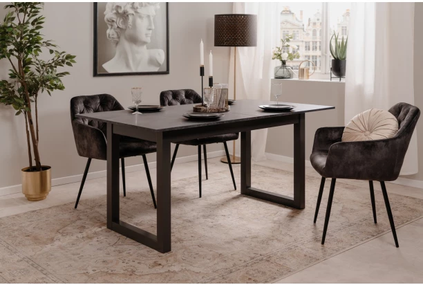 Obdĺžnikový rozkladací jedálenský stôl o veľkosti 160×90 cm je možné zväčšiť na 200 cm šírku. Stôl má moderný dizajn v imitácii šedej bridlice so širokou antracitovou podnožou, ktorá dodáva stolu pevnosť a stabilitu.
