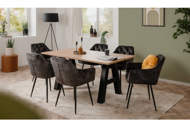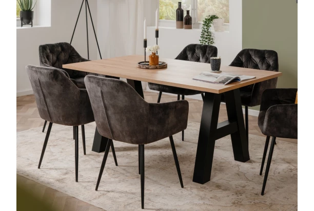 Jedálenský stôl v útulnom drevodekore dub artisan, má širokú čiernu podnož, ktorá podčiarkuje masívny efekt. Stôl s rozmerom 157×90 cm je vybavený rozkladacou funkciou, vďaka ktorej sa ľahko veľkostne prispôsobí podľa aktuálnej potreby. Plocha stola môže byť rozšírená na 195 cm alebo na 234 cm.