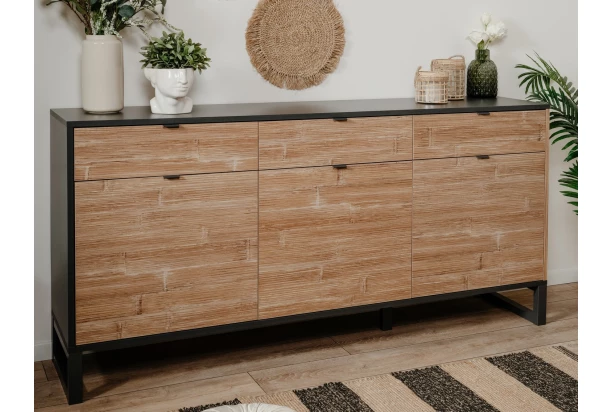 Široká komoda so zásuvkami z kolekcie Sumatra – moderný dizajn nábytku zvýrazňujú kontrastné antracitové plochy v kombinácii s hnedými tónmi bambusového drevodekoru, pri ktorom zaujme štruktúrovaná optika. Nábytok pôsobí zaujímavo, moderne a pritom veľmi útulne. Tmavá antracitová podnož vytvára odľahčený efekt a zároveň celkovo dotvára moderný trendový dizajn.