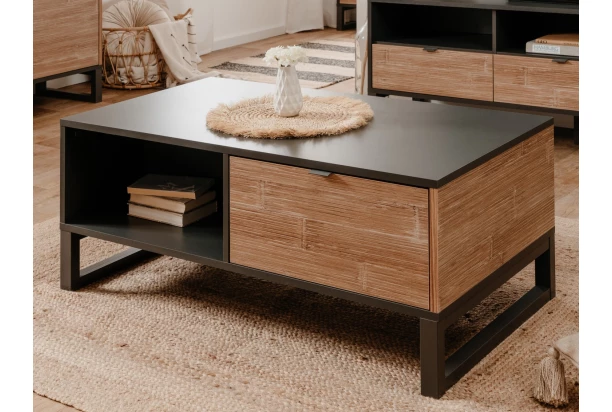 Konferenčný stolík so zásuvkou z kolekcie Sumatra – moderný dizajn nábytku zvýrazňujú kontrastné antracitové plochy v kombinácii s hnedými tónmi bambusového drevodekoru, pri ktorom zaujme štruktúrovaná optika. Nábytok pôsobí zaujímavo, moderne a pritom veľmi útulne. Tmavá antracitová podnož vytvára odľahčený efekt a zároveň celkovo dotvára moderný trendový dizajn.