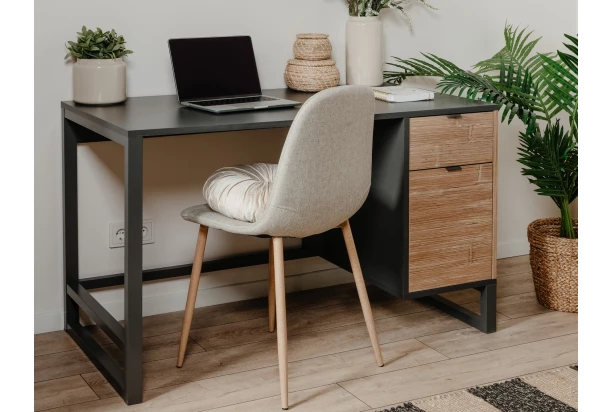 Písací stôl z kolekcie Sumatra – moderný dizajn nábytku zvýrazňujú kontrastné antracitové plochy v kombinácii s hnedými tónmi bambusového drevodekoru, pri ktorom zaujme štruktúrovaná optika. Nábytok pôsobí zaujímavo, moderne a pritom veľmi útulne. Tmavá antracitová podnož vytvára odľahčený efekt a zároveň celkovo dotvára moderný trendový dizajn.